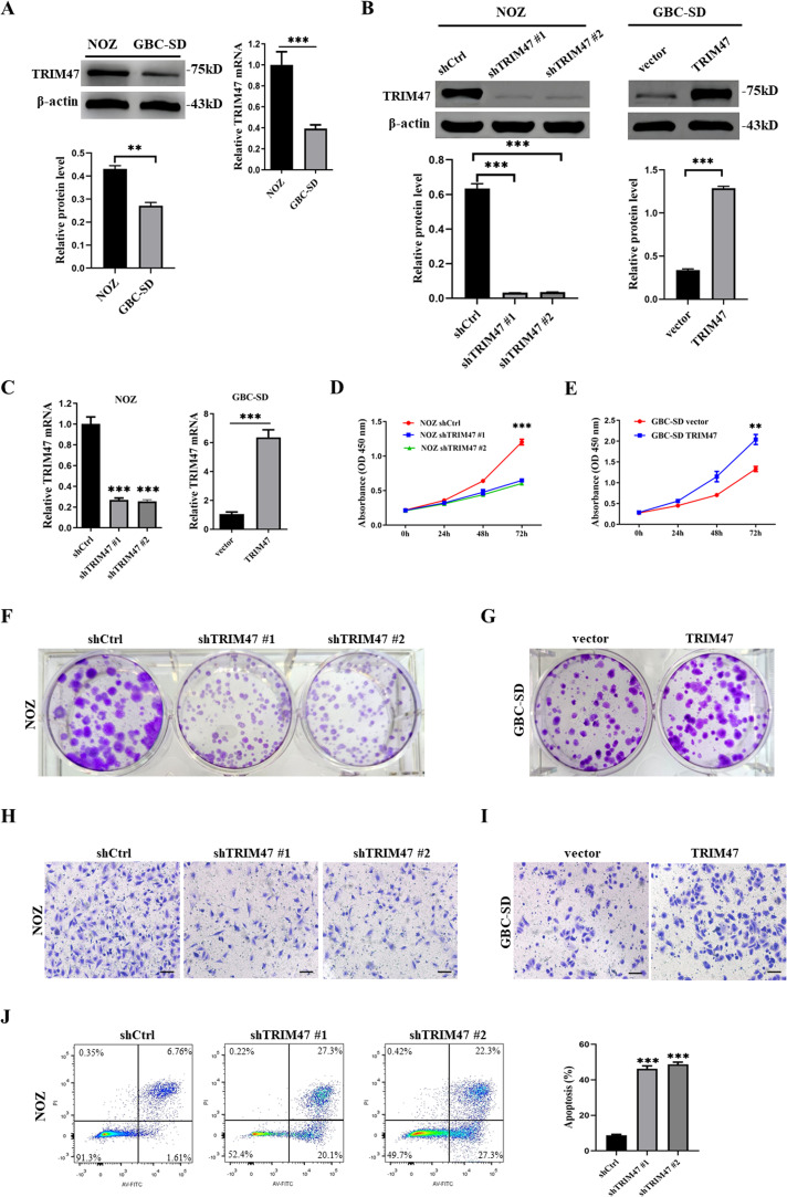 Background: Gallbladder cancer (GBC) is one of the most lethal malignancies worldwide with an extremely poor prognosis. Previous studies have suggested that tripartite motif containing 47 (TRIM47) is involved in the progression of numerous cancers. However, the molecular mechanism and function of TRIM47 in GBC remain unclear.