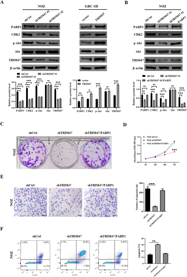 Results: In this study, TRIM47 was upregulated in GBC tissues and associated with shorter overall survival rates and TRIM47 was involved in GBC cell proliferation, migration, and apoptosis. Mechanistically, TRIM47 interacts with PARP1 and mediates the K63-linked polyubiquitination of PARP1, thereby stabilizing its expression. Furthermore, TRIM47 activated the AKT signaling pathway via PARP1.