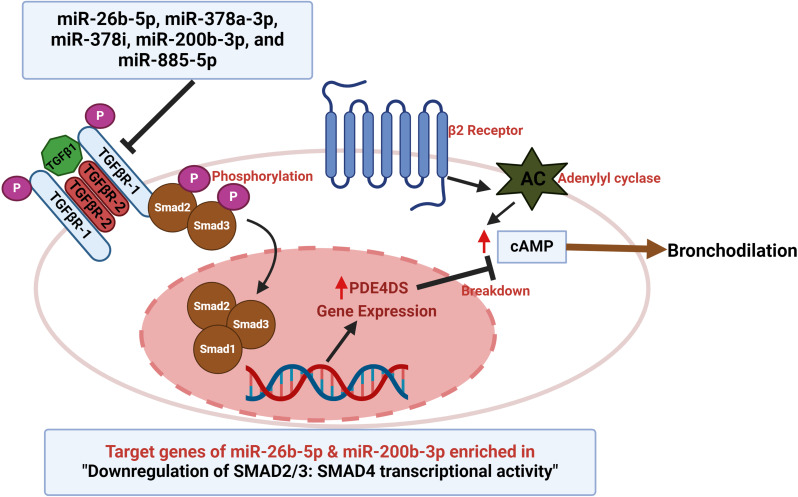 Methods: We used available small RNA sequencing on blood serum from 1,134 asthmatic children aged 6 to 14 years who participated in the Genetics of Asthma in Costa Rica Study (GACRS). We filtered the participants into the highest and lowest bronchodilator response (BDR) quartiles and used DeSeq2 to identify miRNAs with differential expression (DE) in high (N = 277) vs. low (N = 278) BDR group. Replication was carried out in the Leukotriene modifier Or Corticosteroids or Corticosteroid-Salmeterol trial (LOCCS), an adult asthma cohort. The putative target genes of DE miRNAs were identified, and pathway enrichment analysis was performed.