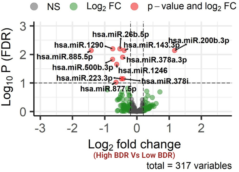 Results: We identified 10 down-regulated miRNAs having odds ratios (OR) between 0.37 and 0.76 for a doubling of miRNA counts and one up-regulated miRNA (OR = 2.26) between high and low BDR group. These were assessed for replication in the LOCCS cohort, where two miRNAs (miR-200b-3p and miR-1246) were associated. Further, functional annotation of 11 DE miRNAs were performed as well as of two replicated miRs. Target genes of these miRs were enriched in regulation of cholesterol biosynthesis by SREBPs, ESR-mediated signaling, G1/S transition, RHO GTPase cycle, and signaling by TGFB family pathways.