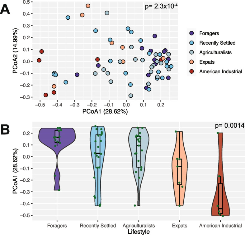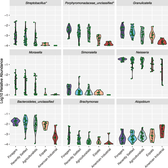 Results: Here, we investigate salivary microbiomes of 63 Nepali individuals representing a spectrum of lifestyles: foraging, subsistence farming (individuals that transitioned from foraging to farming within the last 50 years), agriculturalists (individuals that have transitioned to farming for at least 300 years), and industrialists (expatriates that immigrated to the USA within the last 20 years). We characterize the role of lifestyle in microbial diversity, identify microbes that differ between lifestyles, and pinpoint specific lifestyle factors that may be contributing to differences in the microbiomes across populations. Contrary to prevailing views, when geography is controlled for, oral microbiome alpha diversity does not differ significantly across lifestyles. Microbiome composition, however, follows the gradient of lifestyles from foraging through agrarianism to industrialism, supporting the notion that lifestyle indeed plays a role in the oral microbiome. Relative abundances of several individual taxa, including Streptobacillus and an unclassified Porphyromonadaceae genus, also mirror lifestyle. Finally, we identify specific lifestyle factors associated with microbiome composition across the gradient of lifestyles, including smoking and grain sources.