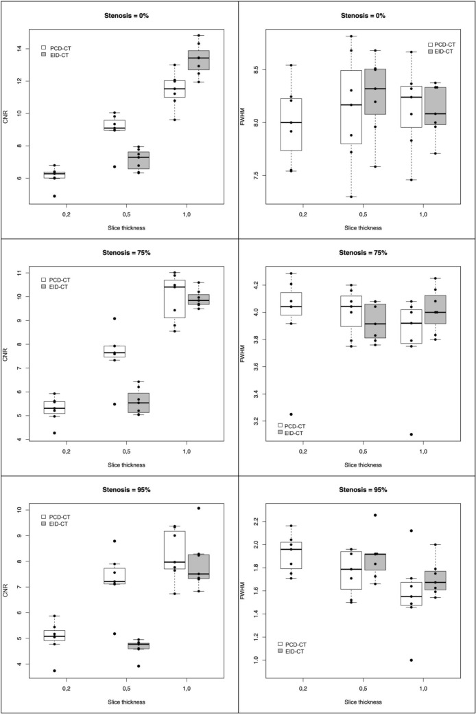 Conclusion: In phantom in-stent restenosis in 8 mm stents, we observed similar full width at half-maximum for photon-counting detector CT and energy-integrating detector CT in 0% and 75% in-stent restenosis, but at 95% in-stent restenosis, FWHM tended to be more accurate in smaller slice thicknesses in both scanners. Subjective image assessment yielded best results at 0.2 mm slice thickness in photon-counting detector CT despite lower contrast-to-noise ratio.