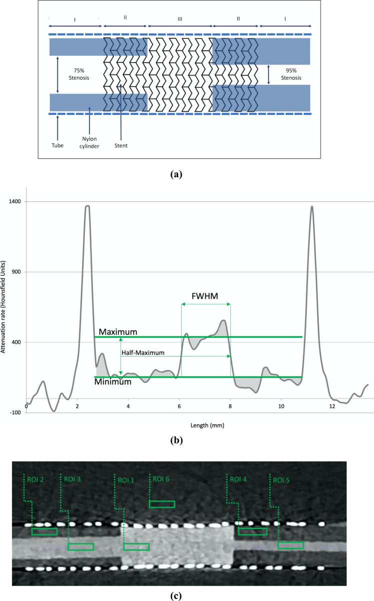 Materials and methods: Nylon cylinders with central bores (4 mm, 2 mm), mimicking 75% and 95% stenoses, were placed inside seven different 8-mm diameter stents and filled with diluted contrast medium. Phantoms were scanned with photon-counting detector CT at slice thicknesses of 0.2 mm (available only in this scanner type), 0.5 mm, and 1.0 mm versus 0.5 mm and 1.0 mm in energy-integrating detector CT at matched CT dose indices. Contrast-to-noise ratios were calculated from attenuation rates. Residual lumen size was measured as full width at half-maximum. Subjective image quality was assessed by two independent blinded raters.