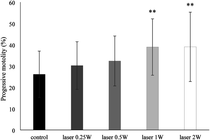 Sperm motility is a crucial factor in male fertility. Photobiomodulation (PBM) has been reported to increase sperm motility, but a consistent approach suitable for identifying standardizable protocols is lacking. We collected asthenozoospermic (n = 70) and normozoospermic (n = 20) semen. The asthenozoospermic samples were irradiated with an 810 nm diode laser, in continuous wave mode, at 0.25 W, 0.5 W, 1 W and 2 W for 60 s on a circular area of 1 cm2 through a novel handpiece with an innovative flat-top profile. Sperm motility was assessed immediately, after 30 and 60 min. A sample size calculator, unpaired t-test and one-way ANOVA with post-hoc Tukey HSD tests were used for statistics. One and 2 W were the most effective outputs in increasing progressive motility compared to control (p < 0.001). The maximum effect was immediately after 1 W-PBM (p < 0.001) and decreased after 60 min (p < 0.001). Time physiologically decreased vitality (p < 0.001), but less in the 1 W-PBM samples (p < 0.05). 1 W-PBM did not affect chromatin condensation. Asthenozoospermic samples displayed an impairment of 80% in oxygen consumption and ATP production and a slight inefficiency of oxidative phosphorylation compared to normozoospermic samples (p < 0.001). 1 W-PBM partially restored the functionality of aerobic metabolism (p < 0.001) by recovery of oxidative phosphorylation efficiency. PBM did not affect lactate dehydrogenase (glycolysis pathway). No irradiated samples increased accumulated malondialdehyde, a marker of lipidic peroxidation. In conclusion, PBM improves progressive motility in asthenozoospermia through increased mitochondrial energetic metabolism without harmful oxidative stress.