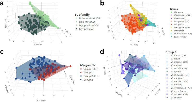 The species-specific character of sounds in the animal kingdom has been extensively documented, yet research on fishes has predominantly focused on a limited number of species, overlooking the potential of acoustic signals to reflect broader taxonomic ranks. In this study, we analyzed acoustic data of hand-held sounds from 388 specimens spanning 5 genera and 33 species within the family Holocentridae, with the objective of evaluating the use of sound characteristics for taxonomic discrimination across various levels (subfamily, genus, species). Sounds could be indicative of grouping. Taxa discriminability depends on taxonomic level; the higher the taxonomic level, the better the discrimination of taxa based on sounds. Analogous to the role of morphological traits in taxonomic delineation, this research corroborates the utility of acoustic features in identifying fish taxa across multiple hierarchical levels. Remarkably, certain holocentrid species have evolved complex sound patterns characterized by unique temporal arrangements where pulses are not continuous but emitted in blocks, facilitating the exploitation of the acoustic space.