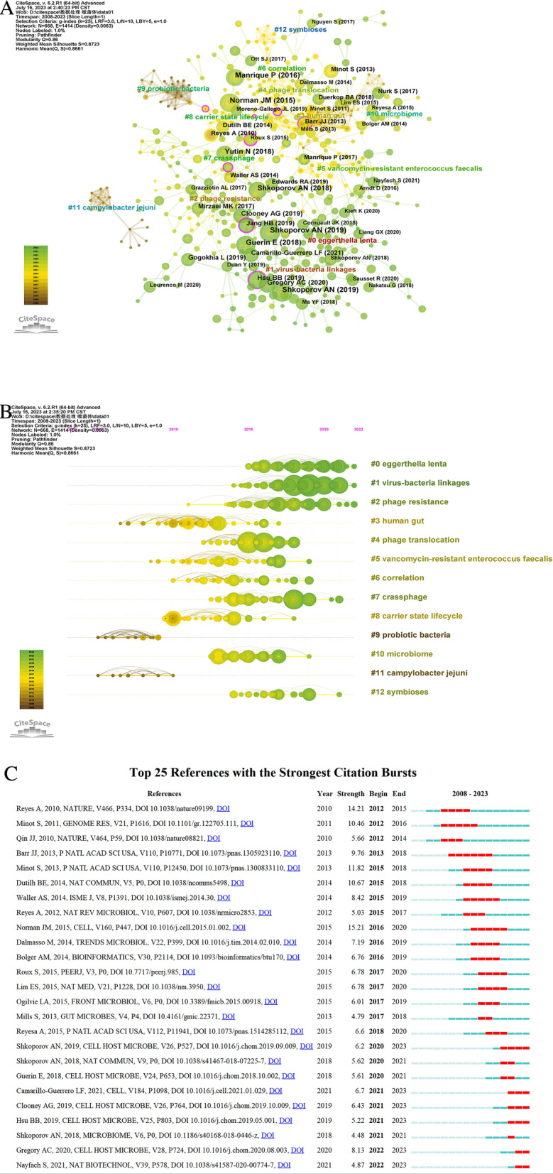 Methods: The downloaded articles were searched from the Web of Science Core Collection database from January 2008 to June 2023. Bibliometric analysis was carried out through CiteSpace, including the analysis of cooperative networks (country/region, institution, and author), co-citations of references, and key words.Visual analysis of three topics, including gut phage, phage and bacteria, and phage and tumor, was conducted.