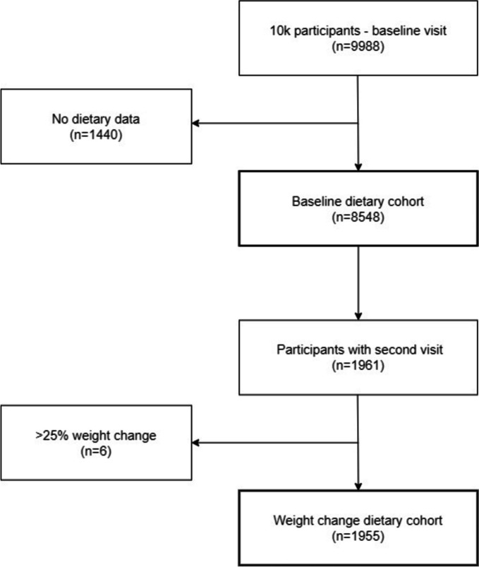 Methods: A total of 8,548 participants from the 10K cohort, from 2019 to 2023, were included in the analysis (53.1% women, mean age 51.7 years). Anthropometric measurements and laboratory results were collected at baseline and at the two-year follow-up visit. Dietary assessment was based on daily food intake digitally logged through an application for at least 3 consecutive days at both timepoints. We compared intake of macronutrients, micronutrients, food groups and daily energy consumption between sex and body mass index (BMI) categories at baseline and weight change categories at follow-up. Using linear regression, we assessed the associations between food categories or specific foods and BMI at baseline as well as weight change percentage at follow-up.