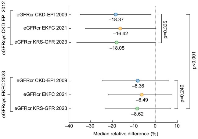 Results: 94.3% of the cohort were White individuals. Median eGFR differed as much as 9 ml/min/1.73 m2 between equations. The median relative differences (Q2) were greater (more negative) when comparing the eGFRcr equations to eGFRcys CKD-EPI 2012, than when comparing them to eGFRcys EKFC 2023 (P < .001). Better average eGFR was associated with smaller mean relative differences in all comparisons but eGFRcr CKD-EPI 2009 with eGFR EKFC 2023 and eGFRcr EKFC 2021 with eGFRcys EKFC 2023. Living kidney donation and belatacept use were independent factors associated with a smaller difference (≥Q3) between eGFRcr and eGFRcys equations, while prednisone use or higher HbA1c were independently associated with a greater difference (≤Q1) between equations.