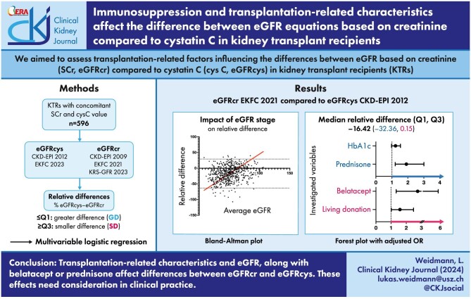 Conclusion: Different eGFR-stages, donor, or recipient characteristics, along with immunosuppression such as belatacept or prednisone, contribute to differences between eGFRcr and eGFRcys. These effects need to be considered in the clinical management of KTRs.