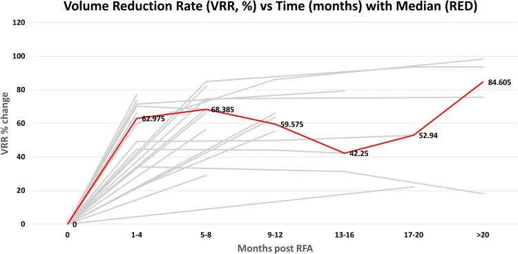 Methods: This work aimed at assessing the efficacy of radiofrequency ablation (RFA) as an alternative treatment option for resolving hyperthyroidism and the nodule volume rate reduction (VRR) and its associated adverse events.