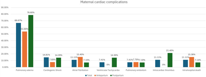 Results: Twenty-seven PPCM patients, with a median age of 33 years (Interquartile range (IQR) = 9), were included. 52% of patients were diagnosed during the postpartum period. Dyspnea New York Heart Association III/IV(NYHA III/IV) was the most common functional symptom (85%). The median left ventricle ejection fraction (LVEF) was 30% (IQR = 11%). Atrial fibrillation occurred in 11.1% of patients, thromboembolic complications occurred in 18.5%, Pulmonary edema occurred in 85% of patients and cardiogenic shock occurred in 14.8% of patients, with two patients requiring Extracorporeal Membrane Oxygenation (ECMO) support. The predominant mode of delivery was a cesarean Sect. (82% of patients), and the indication for a cesarean delivery was obstetrical in 59% of patients. Prematurity occurred in 36% of newborns, and intrauterine fetal death occurred in one pregnancy. The median follow-up was 24 months [6-144 months]. LVEF recovery was noted in 67% of patients. Bromocriptine was administered to six patients (22%), and none of these patients died and out of them, five patients recovered their LVEF (83%). The overall mortality rate during the follow-up period was 15%, comprising three in-hospital cardiac deaths and one occurring two years later due to refractory advanced heart failure. No significant differences were observed between LVEF recovery and LVEF non-recovery groups. Factors significantly associated with mortality were multiparity, poor antenatal care (ANC) attendance, thromboembolic events, cardiogenic shock, and Pulmonary edema. Five patients with LV recovery subsequently became pregnant, none experienced a relapse of PPCM. However, one of the descendants of a patient was diagnosed with dilated cardiomyopathy.