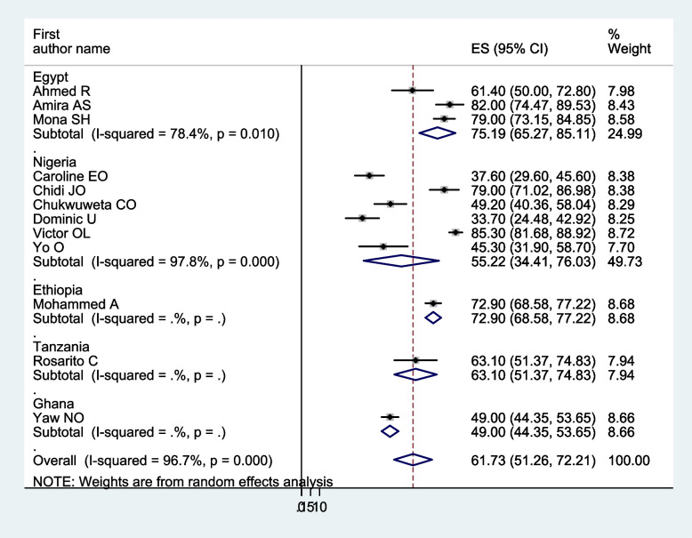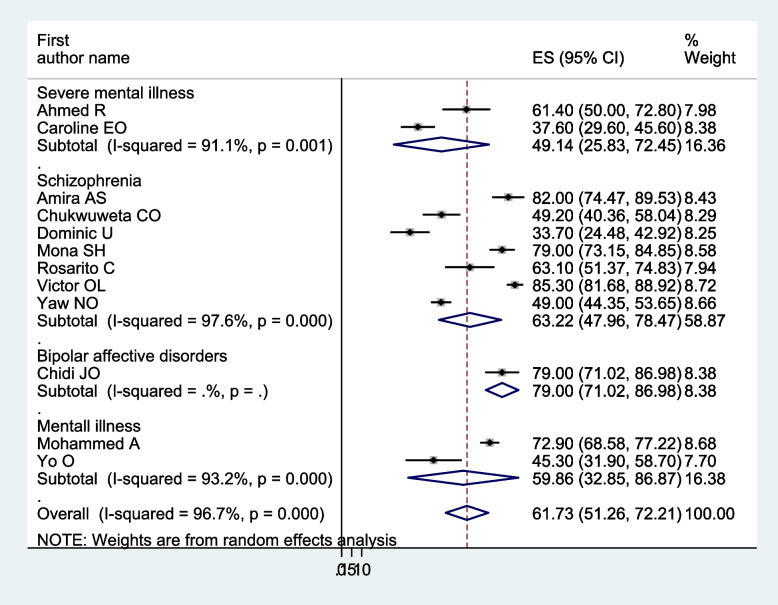 Results: We have included 12 studies conducted in African countries with 2156 study participants, of whom 1176 (54.55%) were female individuals. In this meta-analysis, the pooled prevalence of burden of care among caregivers of people with mental illness in Africa was 61.73 (95% CI: 51.25-72.21%). Further, in subgroup analysis regarding the study country, the pooled prevalence of carer burden among caregivers of people with mental illness in Egypt and Nigeria was 79.19% and 55.22%, respectively.