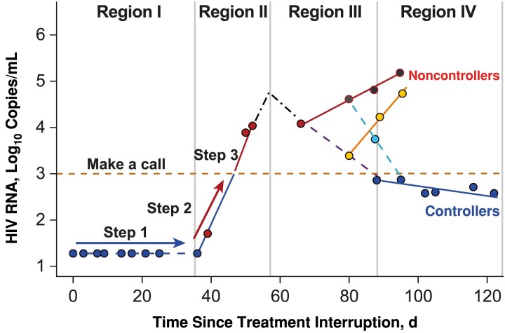 Background: A key research priority for developing a human immunodeficiency virus (HIV) cure strategy is to define the viral dynamics and biomarkers associated with sustained posttreatment control. The ability to predict the likelihood of sustained posttreatment control or noncontrol could minimize the time off antiretroviral therapy (ART) for those destined to be controllers and anticipate longer periods off ART for those destined to be controllers.