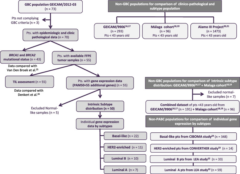 Gestational breast cancer (GBC), defined as breast cancer (BC) diagnosed during pregnancy or the first-year post-partum, accounts for 6-15% of BC cases in women aged 20-44 years. GBC has worse prognosis than non-GBC, but reasons behind are not clear. The GEICAM/2012-03 Study (Molecular Characterization of Gestational Breast Cancer) is a multicenter prospective/retrospective observational registry of patients diagnosed with GBC. From November 2014 to June 2015 seventy patients diagnosed with GBC were included in the study, 30 diagnosed during pregnancy and 40 after delivery. Our current study was aimed to explore differences in epidemiological, clinico-pathological and gene expression features of GBC tumors, from the GEICAM/2012-03 Study, compared to non-GBC tumors from patients of similar age (< 43 years) from six different GEICAM studies, used as non- GBC control population. As per the main objective, the study found multiple differences showing GBC tumors as a different biological entity. GBC showed a more aggressive biology, with higher Ki67 levels, higher incidence of breast and/or ovarian cancer family history, and germline deleterious BRCA1/2 mutations, and are enriched in basal-like intrinsic subtype. GBC patients showed a lower number of tumor infiltrating lymphocytes, while specific genetic signatures highlight differences in GBC´s distinctive transcriptome. Our study shows that GBC is potentially a clinically and molecularly different entity, with specific epidemiological, clinical, and histological features, as well as a distinctive altered immune state and genetic signature. Nevertheless, further studies are needed to better understand the biology of GBC and to identify new targets against which develop new, more effective, targeted therapies.