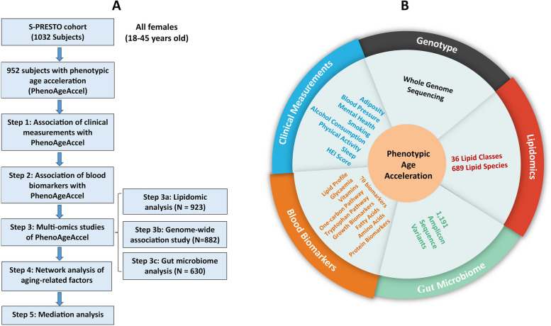 Results: Higher adiposity, glycaemia, plasma saturated fatty acids, kynurenine pathway metabolites, GlycA, riboflavin, nicotinamide, and insulin-like growth factor binding proteins were positively associated with PhenoAgeAccel. Conversely, a healthier diet and higher levels of pyridoxal phosphate, all-trans retinol, betaine, tryptophan, glutamine, histidine, apolipoprotein B, and insulin-like growth factors were inversely associated with PhenoAgeAccel. Lipidomic analysis found 132 lipid species linked to PhenoAgeAccel, with PC(O-36:0) showing the strongest positive association and CE(24:5) demonstrating the strongest inverse association. A genome-wide association study identified rs9864994 as the top genetic variant (P = 5.69E-07) from the ZDHHC19 gene. Gut microbiome analysis revealed that Erysipelotrichaceae UCG-003 and Bacteroides vulgatus were inversely associated with PhenoAgeAccel. Integrative network analysis of aging-related factors underscored the intricate links among clinical, nutritional and lipidomic variables, such as positive associations between kynurenine pathway metabolites, amino acids, adiposity, and insulin resistance. Furthermore, potential mediation effects of blood biomarkers related to inflammation, immune response, and nutritional and energy metabolism were observed in the associations of diet, adiposity, genetic variants, and gut microbial species with PhenoAgeAccel.