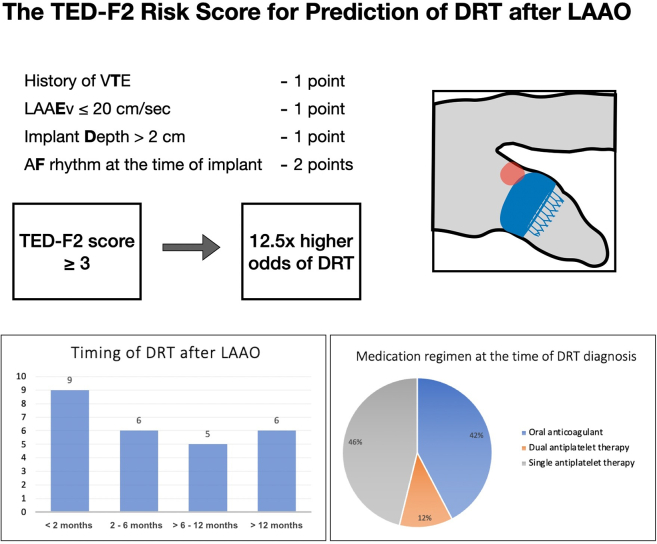 Conclusions: We propose a novel risk score to predict development of DRT after LAAO, comprising history of venous Thromboembolism, LAA Emptying velocity ≤ 20 cm/s, implant Depth > 2 cm (1 point each), and an AF rhythm at implantation (2 points). A TED-F2 risk score of ≥ 3 identified patients who are at greatly elevated risk of developing DRT.