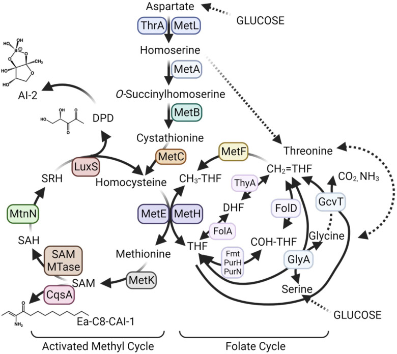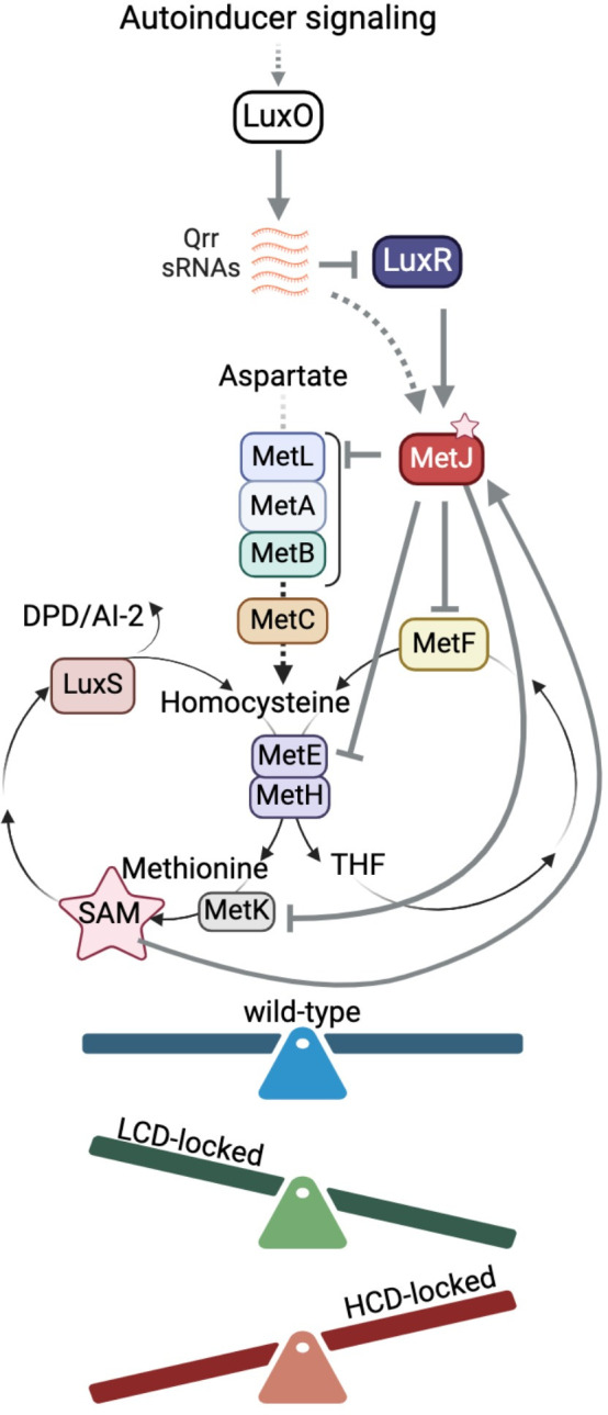 Bacteria sense population density via the cell-cell communication system called quorum sensing (QS). The evolution of QS and its maintenance or loss in mixed bacterial communities is highly relevant to understanding how cell-cell signaling impacts bacterial fitness and competition, particularly under varying environmental conditions such as nutrient availability. We uncovered a phenomenon in which Vibrio cells grown in minimal medium optimize expression of the methionine and tetrahydrofolate (THF) synthesis genes via QS. Strains that are genetically "locked" at high cell density grow slowly in minimal glucose media and suppressor mutants accumulate via inactivating mutations in metF (methylenetetrahydrofolate reductase) and luxR (the master QS transcriptional regulator). In mixed cultures, QS mutant strains initially coexist with wild-type, but as glucose is depleted, wild-type outcompetes the QS mutants. Thus, QS regulation of methionine/THF synthesis is a fitness benefit that links nutrient availability and cell density, preventing accumulation of QS-defective mutants.