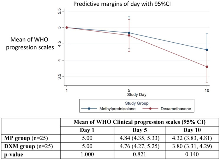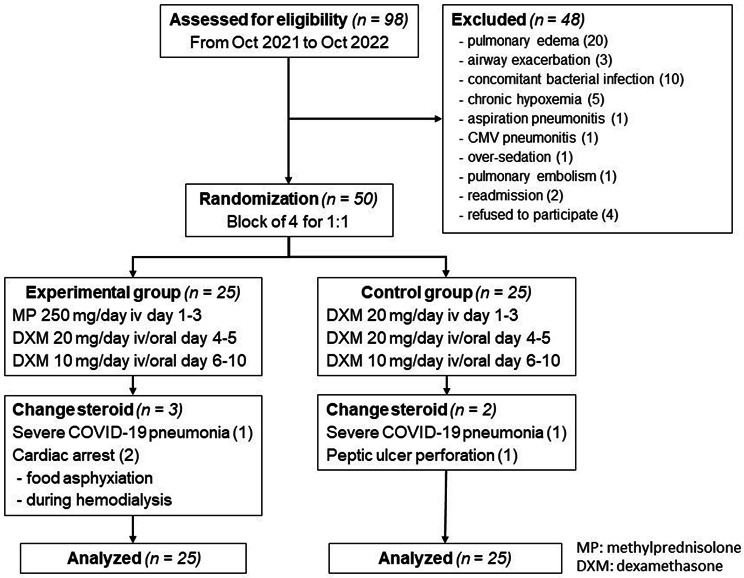 Results: Of 98 eligible patients, the mean age was 76.0 ± 13.3 years. The median date of illness at the time of randomization was 3 days (interquartile range 2, 5). Baseline clinical characteristics and severity did not differ between groups. The WHO clinical progression scales were similar between methylprednisolone and dexamethasone group at 5 and 10 days of treatment [4.84, (95% confidence interval(CI), 4.35-5.33) vs. 4.76 (95% CI, 4.27-5.25), p = 0.821 and 4.32 (95% CI, 3.83-4.81) vs. 3.80 (95% CI, 3.31-4.29), p = 0.140, respectively)]. Both groups did not differ in-hospital mortality, length of hospitalization, and rate of ICU transfer. There were also no differences in steroid-related complications between groups until 90 days of follow-up.