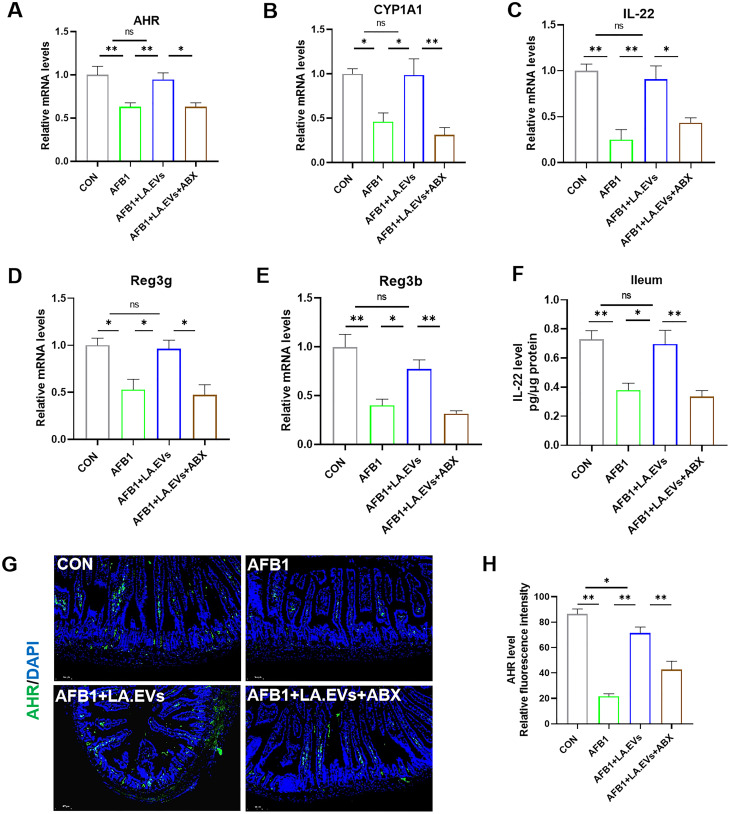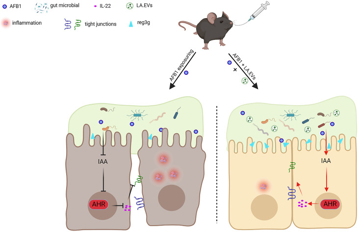 Results: In our study, a new strain named Lactobacillus amylovorus-QC1H (LA-QC1H) was isolated from pig faeces. Then, EVs derived from LA-QC1H were extracted via ultracentrifugation. Our results showed that LA.EVs significantly alleviated AFB1-induced intestinal injury by inhibiting the production of proinflammatory cytokines, decreasing intestinal permeability and increasing the expression of tight junction proteins. Moreover, 16 S rRNA analysis revealed that LA.EVs modulated AFB1-induced gut dysbiosis in mice. However, LA.EVs did not exert beneficial effects in antibiotic-treated mice. LA.EVs treatment increased intestinal levels of indole-3-acetic acid (IAA) and activated intestinal aryl hydrocarbon receptor (AHR)/interleukin-22 (IL-22) signalling in AFB1-exposed mice. Inhibition of intestinal AHR signalling markedly weakened the protective effect of LA.EVs in AFB1-exposed mice.