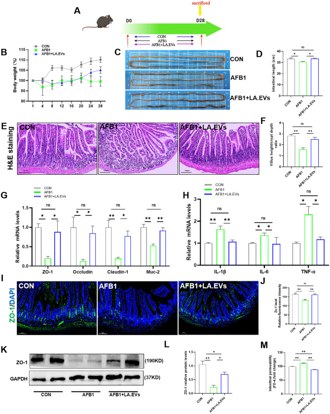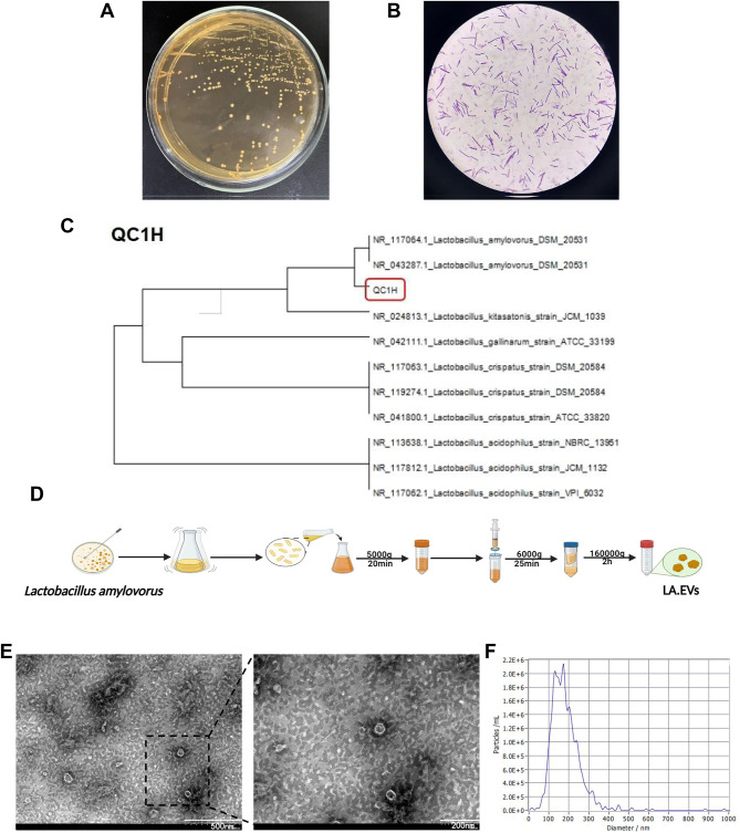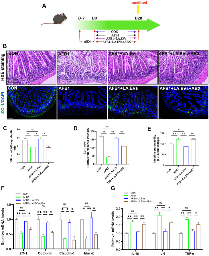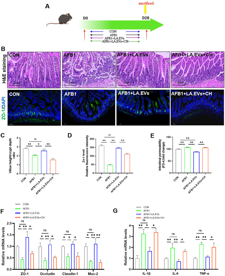 Background: Aflatoxin B1 (AFB1) is a mycotoxin that widely found in the environment and mouldy foods. AFB1 initially targets the intestine, and AFB1-induced intestinal injury cannot be ignored. Lactobacillus amylovorus (LA), a predominant species of Lactobacillus, plays a role in carbohydrate metabolism. Extracellular vesicles (EVs), small lipid membrane vesicles, are widely involved in diverse cellular processes. However, the mechanism by which Lactobacillus amylovorus-QC1H-derived EVs (LA.EVs) protect against AFB1-induced intestinal injury remains unclear.