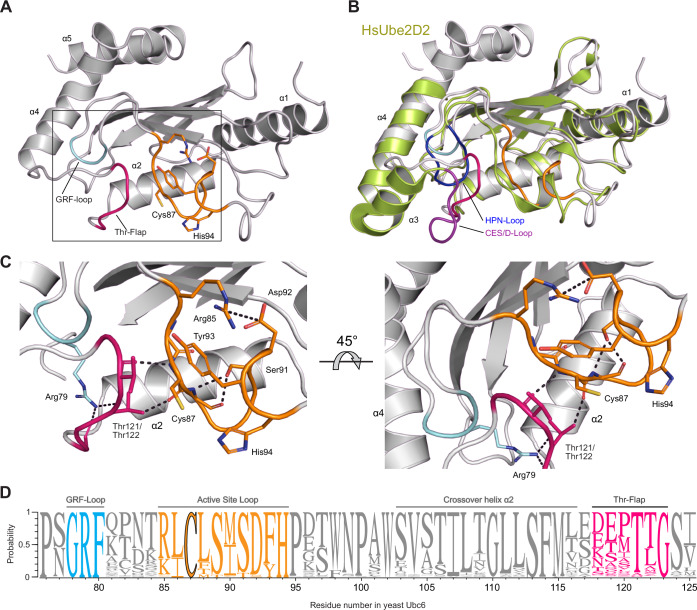Ubiquitin-conjugating enzymes (E2) play a crucial role in the attachment of ubiquitin to proteins. Together with ubiquitin ligases (E3), they catalyze the transfer of ubiquitin (Ub) onto lysines with high chemoselectivity. A subfamily of E2s, including yeast Ubc6 and human Ube2J2, also mediates noncanonical modification of serines, but the structural determinants for this chemical versatility remain unknown. Using a combination of X-ray crystallography, molecular dynamics (MD) simulations, and reconstitution approaches, we have uncovered a two-layered mechanism that underlies this unique reactivity. A rearrangement of the Ubc6/Ube2J2 active site enhances the reactivity of the E2-Ub thioester, facilitating attack by weaker nucleophiles. Moreover, a conserved histidine in Ubc6/Ube2J2 activates a substrate serine by general base catalysis. Binding of RING-type E3 ligases further increases the serine selectivity inherent to Ubc6/Ube2J2, via an allosteric mechanism that requires specific positioning of the ubiquitin tail at the E2 active site. Our results elucidate how subtle structural modifications to the highly conserved E2 fold yield distinct enzymatic activity.