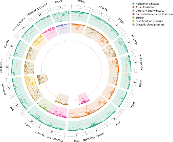 Several cardiovascular traits and diseases co-occur with Alzheimer's disease. We mapped their shared genetic architecture using multi-trait genome-wide association studies. Subsequent fine-mapping and colocalisation highlighted 16 genetic loci associated with both Alzheimer's and cardiovascular diseases. We prioritised rs11786896, which colocalised with Alzheimer's disease, atrial fibrillation and expression of PLEC in the heart left ventricle, and rs7529220, which colocalised with Alzheimer's disease, atrial fibrillation and expression of C1Q family genes. Single-cell RNA-sequencing data, co-expression network and protein-protein interaction analyses provided evidence for different mechanisms of PLEC, which is upregulated in left ventricular endothelium and cardiomyocytes with heart failure and in brain astrocytes with Alzheimer's disease. Similar common mechanisms are implicated for C1Q in heart macrophages with heart failure and in brain microglia with Alzheimer's disease. These findings highlight inflammatory and pleomorphic risk determinants for the co-occurrence of Alzheimer's and cardiovascular diseases and suggest PLEC, C1Q and their interacting proteins as potential therapeutic targets.