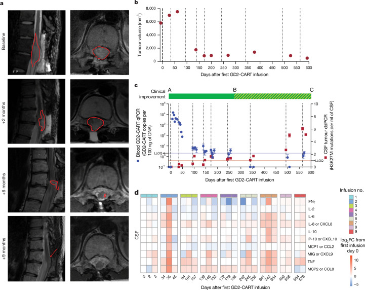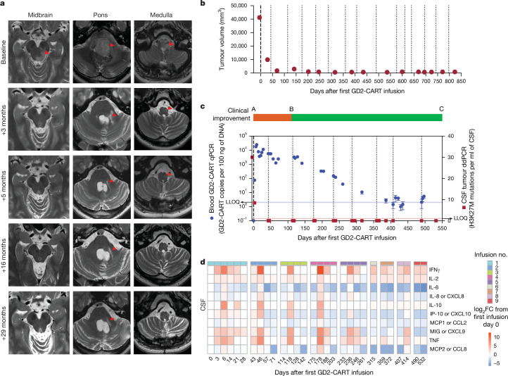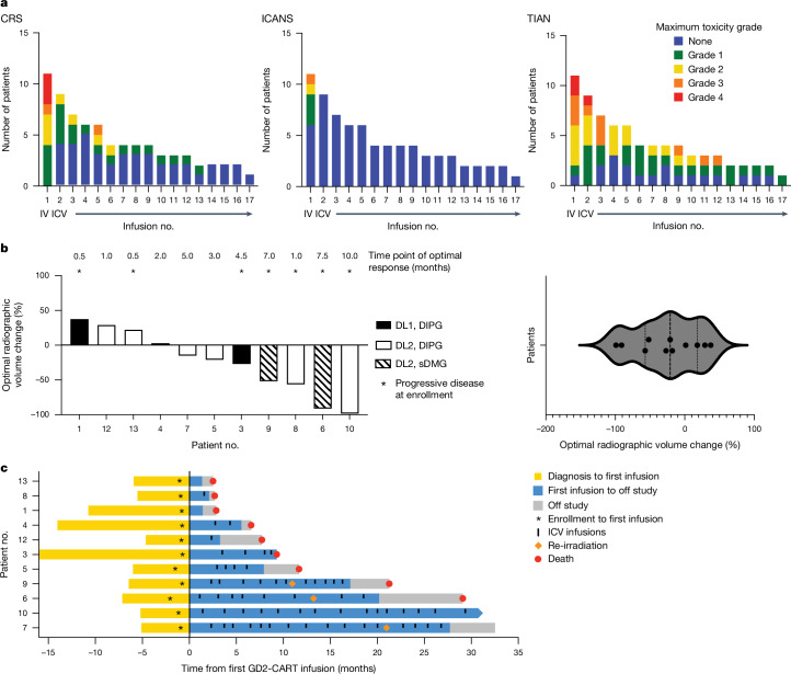H3K27M-mutant diffuse midline gliomas (DMGs) express high levels of the disialoganglioside GD2 (ref. 1). Chimeric antigen receptor-modified T cells targeting GD2 (GD2-CART) eradicated DMGs in preclinical models1. Arm A of Phase I trial no. NCT04196413 (ref. 2) administered one intravenous (IV) dose of autologous GD2-CART to patients with H3K27M-mutant pontine (DIPG) or spinal DMG (sDMG) at two dose levels (DL1, 1 × 106 kg-1; DL2, 3 × 106 kg-1) following lymphodepleting chemotherapy. Patients with clinical or imaging benefit were eligible for subsequent intracerebroventricular (ICV) intracranial infusions (10-30 × 106 GD2-CART). Primary objectives were manufacturing feasibility, tolerability and the identification of maximally tolerated IV dose. Secondary objectives included preliminary assessments of benefit. Thirteen patients enroled, with 11 receiving IV GD2-CART on study (n = 3 DL1 (3 DIPG); n = 8 DL2 (6 DIPG, 2 sDMG)). GD2-CART manufacture was successful for all patients. No dose-limiting toxicities occurred on DL1, but three patients experienced dose-limiting cytokine release syndrome on DL2, establishing DL1 as the maximally tolerated IV dose. Nine patients received ICV infusions, with no dose-limiting toxicities. All patients exhibited tumour inflammation-associated neurotoxicity, safely managed with intensive monitoring and care. Four patients demonstrated major volumetric tumour reductions (52, 54, 91 and 100%), with a further three patients exhibiting smaller reductions. One patient exhibited a complete response ongoing for over 30 months since enrolment. Nine patients demonstrated neurological benefit, as measured by a protocol-directed clinical improvement score. Sequential IV, followed by ICV GD2-CART, induced tumour regressions and neurological improvements in patients with DIPG and those with sDMG.