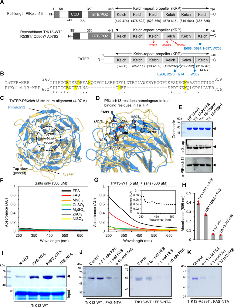 The potency of frontline antimalarial drug artemisinin (ART) derivatives is triggered by heme-induced cleavage of the endoperoxide bond to form reactive heme-ART alkoxy radicals and covalent heme-ART adducts, which are highly toxic to the parasite. ART-resistant (ART-R) parasites with mutations in the Plasmodium falciparum Kelch-containing protein Kelch13 (PfKekch13) exhibit impaired hemoglobin uptake, reduced yield of hemoglobin-derived heme, and thus decreased ART activation. However, any direct involvement of PfKelch13 in heme-mediated ART activation has not been reported. Here, we show that the purified recombinant PfKelch13 wild-type (WT) protein displays measurable binding affinity for iron and heme, the main effectors for ART activation. The heme-binding property is also exhibited by the native PfKelch13 protein from parasite culture. The two ART-R recombinant PfKelch13 mutants (C580Y and R539T) display weaker heme binding affinities compared to the ART-sensitive WT and A578S mutant proteins, which further translates into reduced yield of heme-ART derivatives when ART is incubated with the heme molecules bound to the mutant PfKelch13 proteins. In conclusion, this study provides the first evidence for ART activation via the heme-binding propensity of PfKelch13. This mechanism may contribute to the modulation of ART-R levels in malaria parasites through a novel function of PfKelch13.