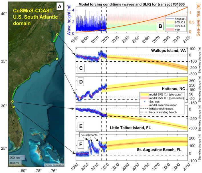 Coastal change is a complex combination of multi-scale processes (e.g., wave-driven cross-shore and longshore transport; dune, bluff, and cliff erosion; overwash; fluvial and inlet sediment supply; and sea-level-driven recession). Historical sea-level-driven coastal recession on open ocean coasts is often outpaced by wave-driven change. However, future sea-level-driven coastal recession is expected to increase significantly in tandem with accelerating rates of global sea-level rise. Few models of coastal sediment transport can resolve the multitude of coastal-change processes at a given beach, and fewer still are computationally efficient enough to achieve large-scale, long-term simulations, while accounting for historical behavior and uncertainties in future climate. Here, we show that a scalable, data-assimilated shoreline-change model can achieve realistic simulations of long-term coastal change and uncertainty across large coastal regions. As part of the modeling case study of the U.S. South Atlantic Coast (Miami, Florida to Delaware Bay) presented here, we apply historical, satellite-derived observations of shoreline position combined with daily hindcasted and projected wave and sea-level conditions to estimate long-term coastal change by 2100. We find that 63 to 94% of the shorelines on the U.S. South Atlantic Coast are projected to retreat past the present-day extent of sandy beach under 1.0 to 2.0 m of sea-level rise, respectively, without large-scale interventions.