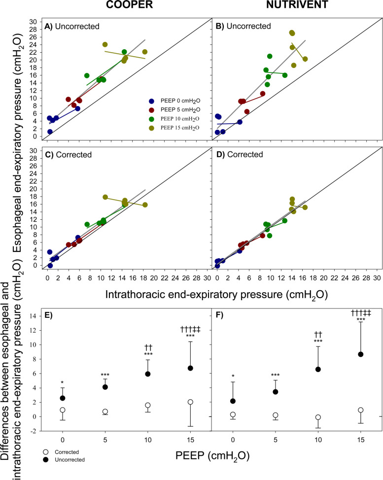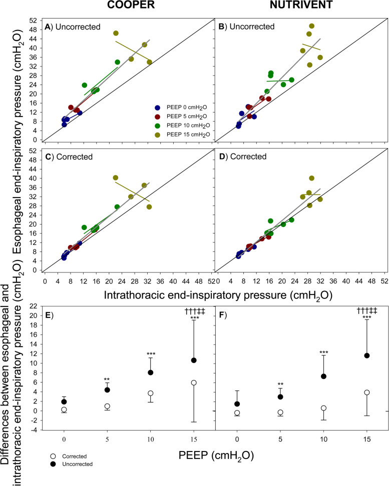 Results: We found that both catheters significantly overestimated absolute esophageal pressure compared to intrathoracic pressure (5.01 ± 3.32 and 6.06 ± 5.62 cmH2O at end-expiration and end-inspiration, respectively), with error increasing at higher positive end-expiratory pressure levels (end-expiration: 2.36 ± 2.03, 3.77 ± 1.37, 6.24 ± 2.51 and 7.69 ± 4.02 for each PEEP level, P < 0.0001; end-inspiration: 1.71 ± 2.10, 3.70 ± 1.73, 7.67 ± 3.62 and 11.14 ± 7.60 for each PEEP level, P = 0.0004). Applying the correction technique significantly improved agreement for absolute values (0.82 ± 1.62 and 1.86 ± 3.94 cmH2O at end-expiration and end-inspiration, respectively). Esophageal pressure swings accurately estimated intrathoracic pressure swings at low-medium intrathoracic pressures (-0.64 ± 0.62, -0.07 ± 0.53, 1.43 ± 1.51, and 3.45 ± 3.94 at PEEP 0, 5, 10 and 15 cmH2O, respectively; P = 0.0197).