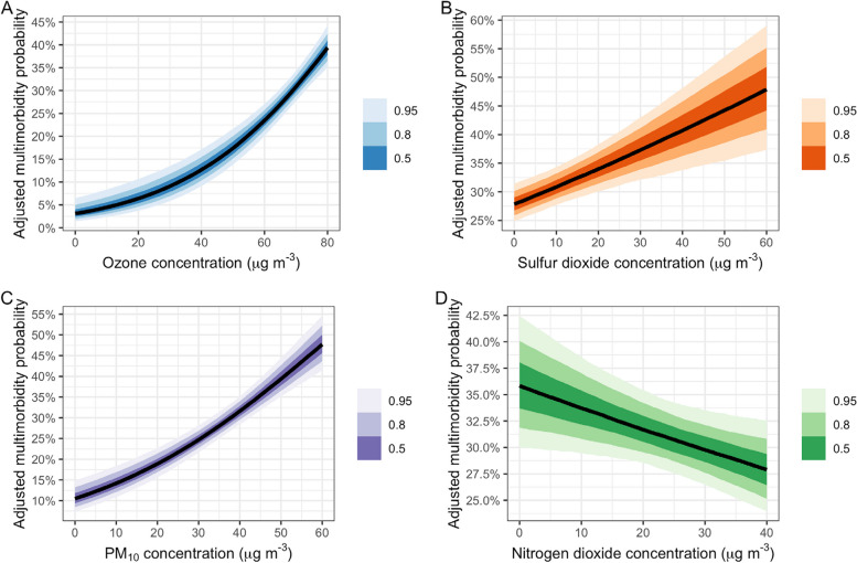 Results: The overall prevalence of multimorbidity was 33.4% [32.6%-34.2%]. Six latent classes of multimorbidity were identified: Healthy, Multicondition, Cardiovascular, Metabolic syndrome, Respiratory, and Musculoskeletal. Annual increases in PM10 and SO2 concentrations, as well as daily increases in O3 concentrations, significantly raised the odds of having multimorbidity (OR = 1.02, 95% CI 1.02-1.03; OR = 1.01, 95% CI 1.00-1.02 and OR = 1.03, 95% CI 1.02-1.03, respectively). A pattern of increased risk was observed with rising levels of water contamination. Exposure to physico-chemical, microbiological and combined contamination was associated with a 3.92%, 5.17% and 5.54% higher probability, respectively, of having multiple chronic conditions. There was strong evidence that air pollutants, as well as chemical and microbial water contamination, were significantly associated with higher odds of the most common clusters of multimorbidity identified by LCA.