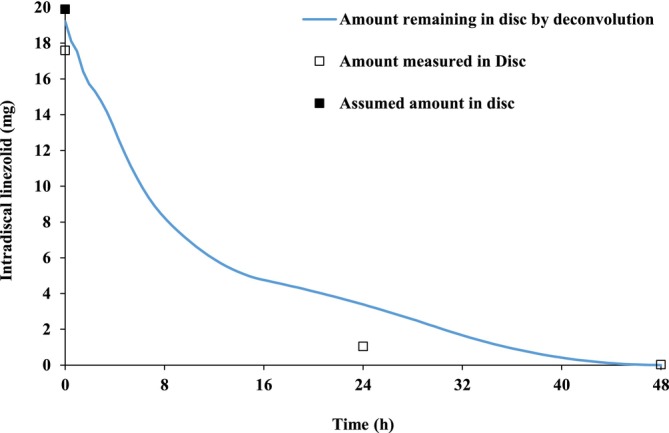 Results: Micronized linezolid, formulated as a powder suspension using a vehicle containing poloxamer 407 and iohexol, provided a temperature-dependent radio-opaque gel that was suitable for image-guided percutaneous intradiscal administration. Efficacy in a sheep model of intradiscal Staphylococcus aureus infection was demonstrated. The formulation provides a high level of sheep disc tissue exposure, with Cmax of 6500 μg/g and limited systemic exposure, with a plasma Cmax of 0.04 μg/mL per 0.1 mL dose (5 mg of linezolid). Deconvolution of plasma linezolid pharmacokinetics correlated with linezolid remaining in the disc over time. Observations from a GLP local tolerance study with the linezolid formulation were of a minor nature and related to the intradiscal administration procedure.