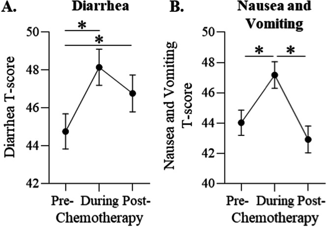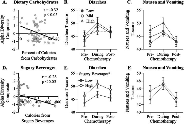 Chemotherapy frequently causes debilitating gastrointestinal symptoms, which are inadequately managed by current treatments. Recent research indicates the gut microbiome plays a role in the pathogenesis of these symptoms. The current study aimed to identify pre-chemotherapy microbiome markers that predict gastrointestinal symptom severity after breast cancer chemotherapy. Fecal samples, blood, and gastrointestinal symptom scores were collected from 59 breast cancer patients before, during, and after chemotherapy. Lower pre-chemotherapy microbiome alpha diversity and abundance of specific microbes (e.g., Faecalibacterium) predicted greater chemotherapy-induced gastrointestinal symptoms. Notably, tumor and diet characteristics were associated with lower pre-chemotherapy alpha diversity. Lower baseline alpha diversity also predicted higher chemotherapy-induced microbiome disruption, which was positively associated with diarrhea symptoms. The results indicate certain cancer patients have lower microbiome diversity before chemotherapy, which is predictive of greater chemotherapy-induced gastrointestinal symptoms and a less resilient microbiome. These patients may be strong candidates for pre-chemotherapy microbiome-directed preventative interventions (e.g., diet change).