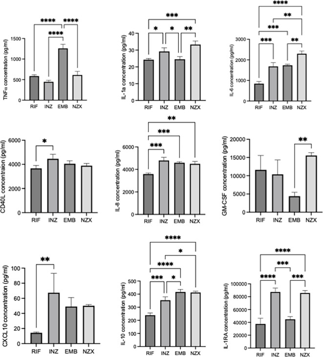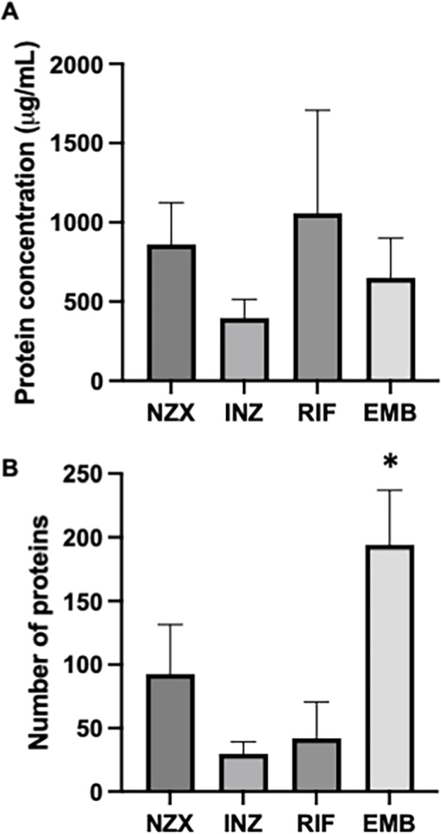 Pulmonary tuberculosis (TB) causes progressive and irreversible damage to lung tissue, a damage that may not fully resolve after treatment. Mycobacterial vesicles (MVs), which are poorly understood, may contribute to TB pathology. This study investigated the effects of stress, such as treatment with conventional TB antibiotics rifampicin, isoniazid, ethambutol, or treatment with an antimycobacterial peptide (NZX), on mycobacterial vesiculation. Stress from minimal inhibitory concentrations of antibiotics, or peptide all increased MV formation. Electron microscopy and lipid profiling revealed that these vesicles, about 40 nm in size, were released from the bacterial inner membrane and consisted of apolar lipids. Using mass spectrometry, the study identified key differences in MVs protein cargo dependent on the antibiotic used, especially with ethambutol-induced MVs that contained proteins from several mycobacterial pathways. Additionally, toxicology analysis using different concentrations of MVs on primary human macrophages and the monocytic cells indicated that MVs from the different treatments were not toxic to human cells, however induced specific inflammatory profiles. In conclusion, this study identified mycobacterial vesicles to be a potential contributor to tuberculosis pathology.