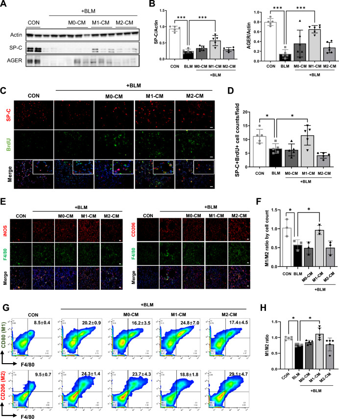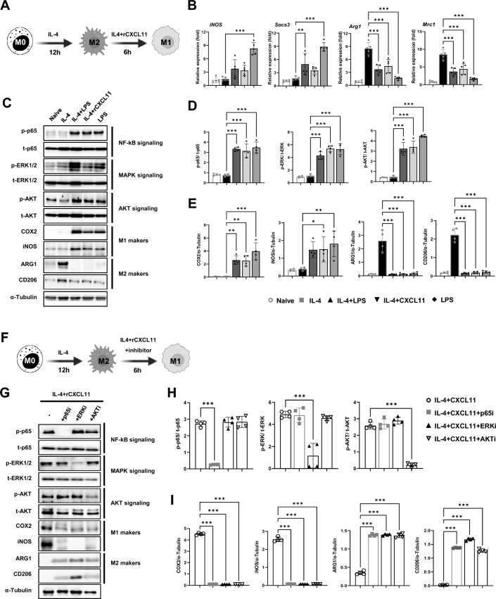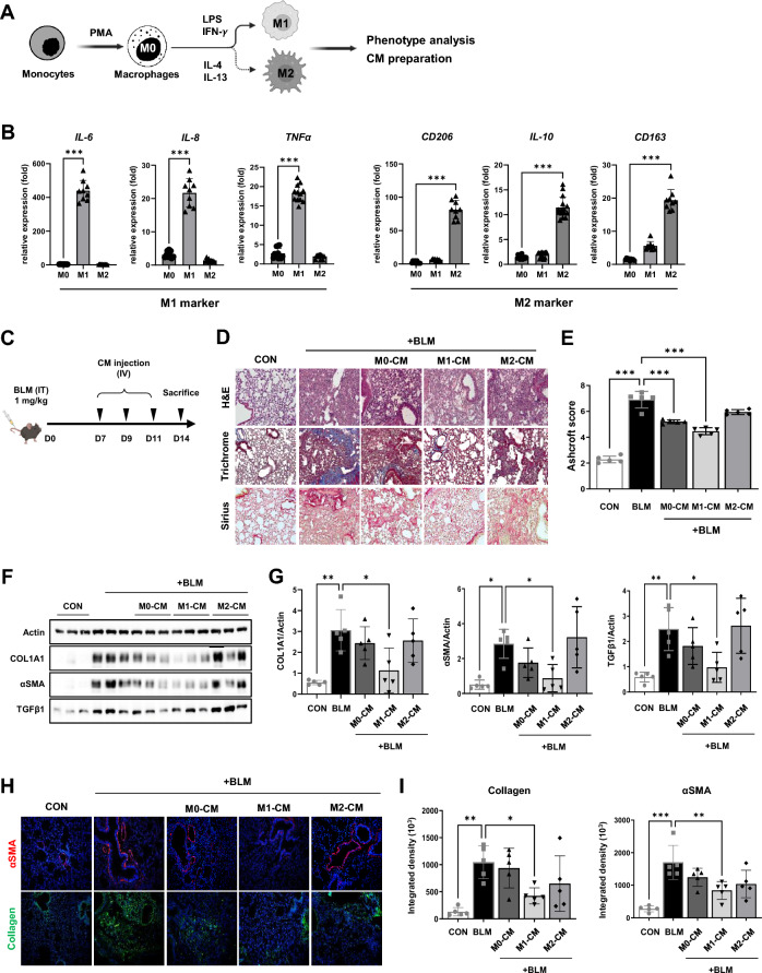 Results: We intravenously administered secretome derived from naïve (M0) and polarized macrophages (M1 and M2) into PF mice and found that lung fibrosis was effectively reversed in only the M1-treated group, with modulation of the M1/M2 ratio toward the ratio of the control group. These findings suggest that the factors secreted from M1 macrophages contribute to alleviating PF by targeting macrophages and reshaping the immunofibrotic environment in a paracrine manner. Secretome analysis of macrophages identified CXCL11 as an M1-specific chemokine, and administration of recombinant CXCL11 effectively improved fibrosis with the reduction of M2 macrophages in vivo. Furthermore, a mechanistic in vitro study revealed that CXCL11 reprogrammed macrophages from M2 to M1 through the activation of pERK, pAKT, and p65 signaling.
