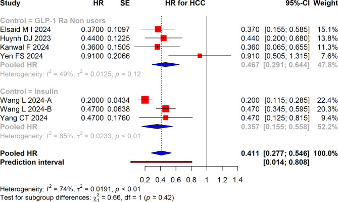 Results: Eight studies met the inclusion criteria. The pooled analysis demonstrated that GLP-1 RA treatment was associated with a significant reduction in HCC risk compared to insulin or no GLP-1 RA treatment (pooled HR = 0.41, 95% CI: 0.28 to 0.55), with considerable heterogeneity (I² = 74%). Compared to metformin and DPP-4 inhibitors, GLP-1 RAs did not significantly alter HCC risk (HR = 0.99, 95% CI: 0.79 to 1.27 for metformin; HR = 1.05, 95% CI: 0.80 to 1.39 for DPP-4 inhibitors). However, GLP-1 RAs were associated with a reduced risk compared to sulfonylureas (HR = 0.78, 95% CI: 0.65 to 0.93).