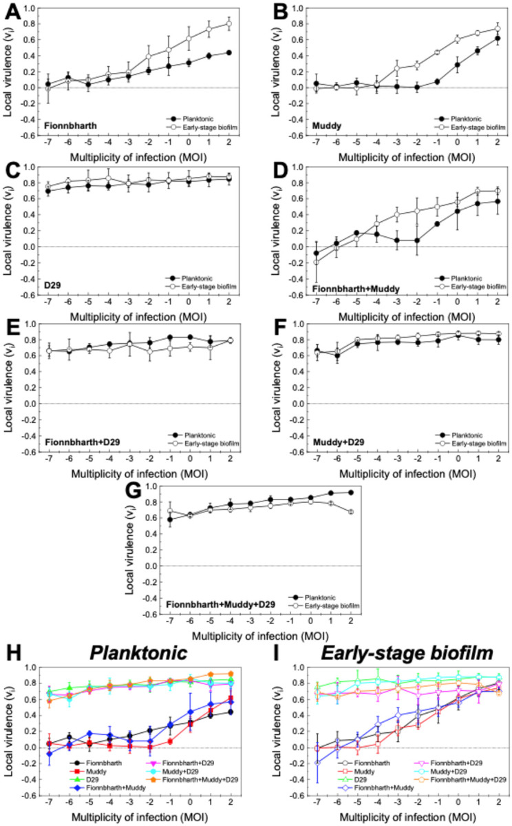 The global tuberculosis (TB) epidemic affected 10 million people and caused 1.3 million deaths in 2022 alone. Multidrug-resistant TB is successfully treated in less than 60% of cases by long, expensive and aggressive treatments. Mycobacteriophages, viruses that can infect bacteria such as Mycobacterium tuberculosis-the species responsible for TB, have the potential to redefine TB prevention and treatments. However, the development of phage-based products necessitates the assessment of numerous parameters, including virulence and adsorption, to ensure their performance and quality. In this work, we characterized the virulence of three different mycobacteriophages (Fionnbharth, Muddy and D29), alone and as cocktails, against a TB model host (Mycobacterium smegmatis) under planktonic and early-stage biofilm growth conditions. Phage D29 and cocktails containing D29 had the highest virulence under all conditions. Interestingly, phages Fionnbharth and Muddy and their combination showed higher virulence against early-stage biofilm than against the planktonic phenotype. Adsorption assays indicated that all three phages had lower adsorption efficiencies on the early-stage biofilm phenotype than on the planktonic one, suggesting a reduced availability of receptors in the former. Given that, despite these lower adsorption efficiencies, the virulence of the phages and phage cocktails was either unchanged or higher against the early-stage biofilm, this phenotype must display properties that are favorable to other steps of the infection process. These results inform us on the dynamics of mycobacteriophage infections, alone and in cocktail formulations, under different host growth conditions, and serve as a basis for the development of phage products targeting mycobacteria biofilms.