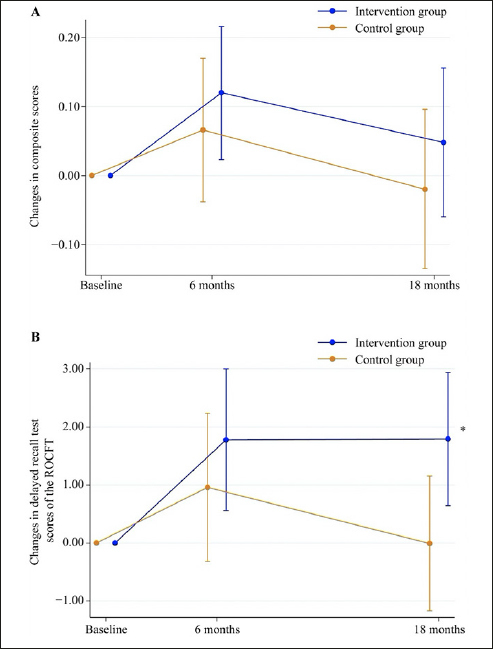 Measurements: The primary outcome was the change in a composite score combining several neuropsychological tests from baseline to the 18-month follow-up. To assess the differences in cognitive changes between the intervention and control groups, a mixed-effects model for repeated measures was used.
