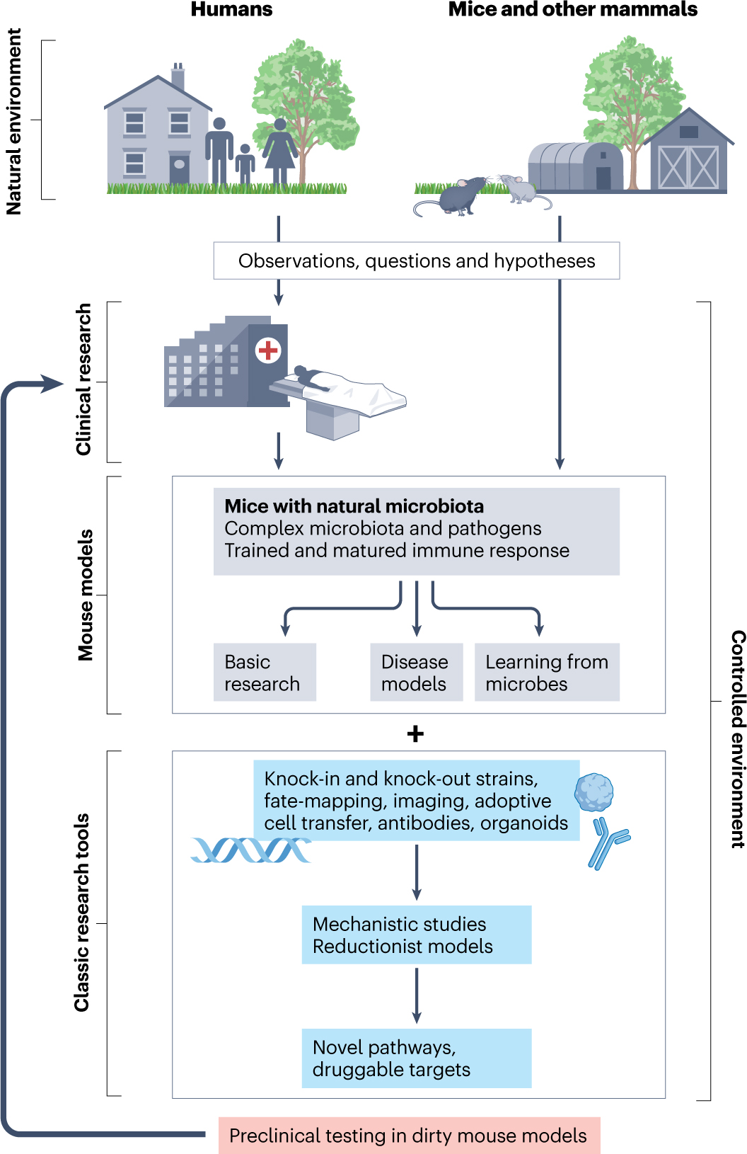 Fundamental discoveries in many aspects of mammalian physiology have been made using laboratory mice as research models. These studies have been facilitated by the genetic tractability and inbreeding of such mice, the large set of immunological reagents that are available, and the establishment of environmentally controlled, high-throughput facilities. Such facilities typically include barriers to keep the mouse colonies free of pathogens and the frequent re-derivation of the mice severely limits their commensal flora. Because humans have co-evolved with microorganisms and are exposed to a variety of pathogens, a growing community of researchers posits that preclinical disease research can be improved by studying mice in the context of the microbiota and pathogens that they would encounter in the natural world. Here, we provide a perspective of how these different approaches can be combined and integrated to improve existing mouse models to enhance our understanding of disease mechanisms and develop new therapies for humans. We also propose that the term 'mice with natural microbiota' is more appropriate for describing these models than existing terms such as 'dirty mice'.