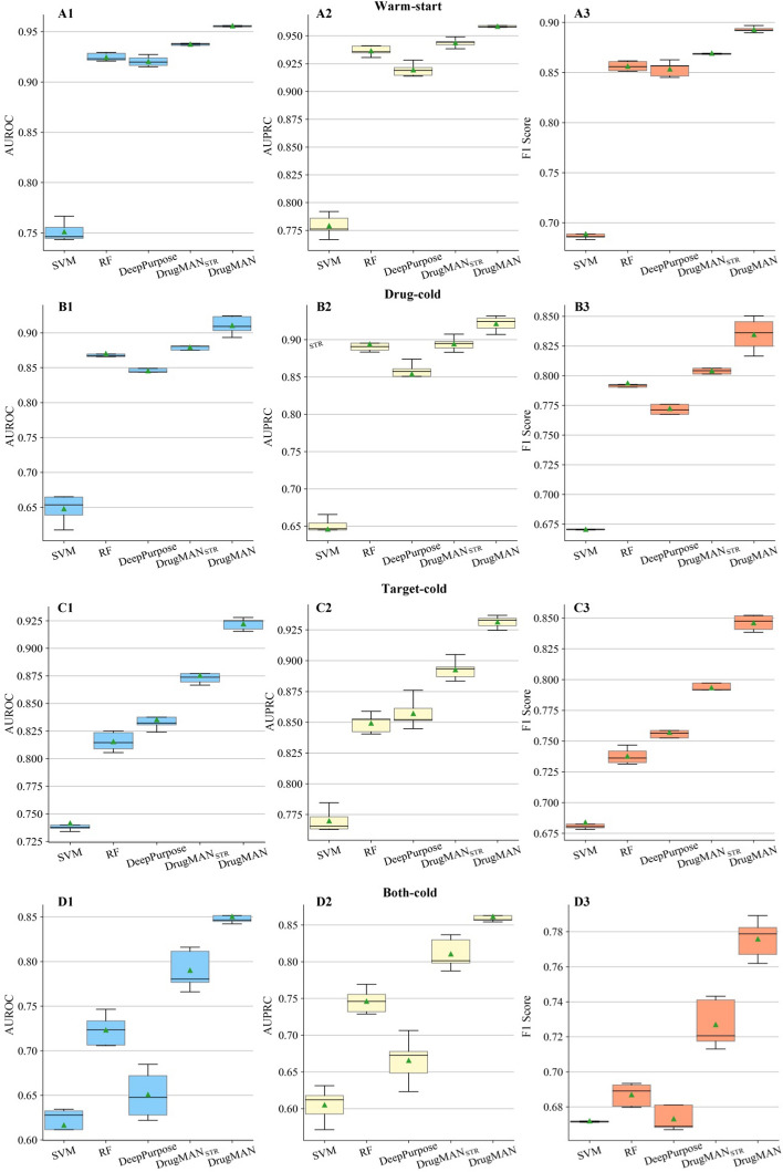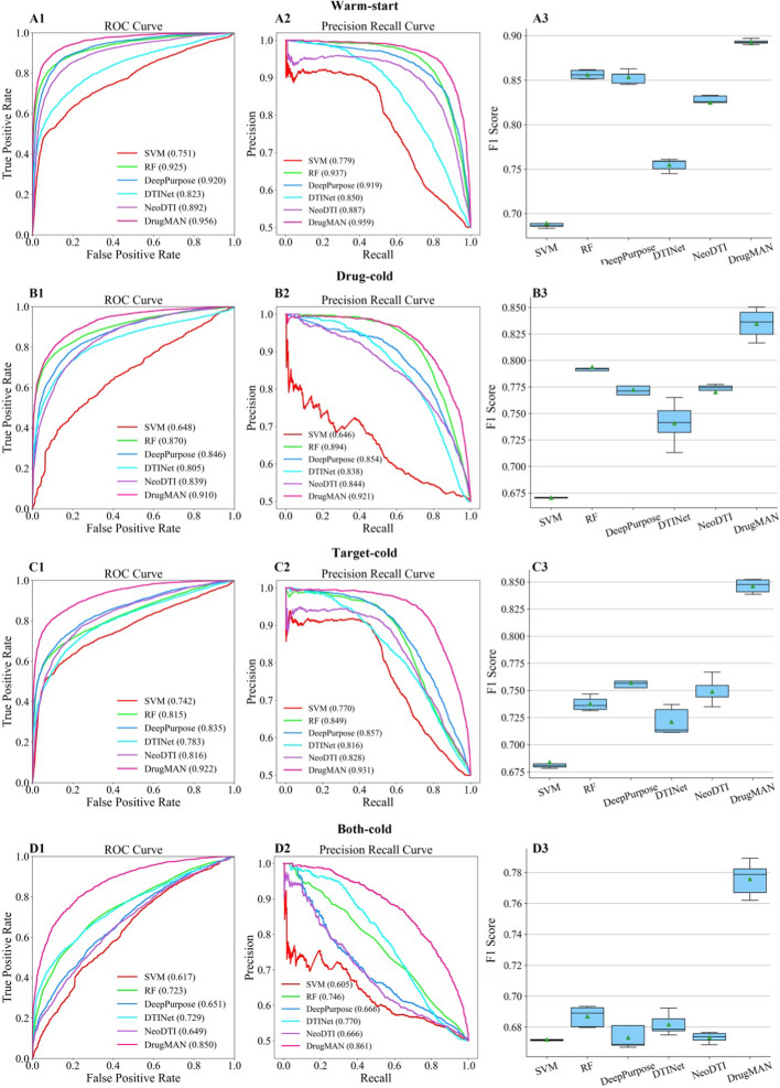 Results: DrugMAN achieved the best performance compared with cheminformation-based methods SVM, RF, DeepPurpose and network-based deep learing methods DTINet and NeoDT in four different scenarios, especially in real-world scenarios. Compared with SVM, RF, deepurpose, DTINet, and NeoDT, DrugMAN showed the smallest decrease in AUROC, AUPRC, and F1-Score from warm-start to Both-cold scenarios. This result is attributed to DrugMAN's learning from heterogeneous data and indicates that DrugMAN has a good generalization ability. Taking together, DrugMAN spotlights heterogeneous information to mine drug-target interactions and can be a powerful tool for drug discovery and drug repurposing.