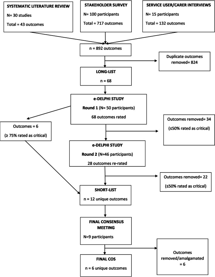 Methods: Stage 1 of the COS development involved compiling a comprehensive long-list of outcomes from key sources including i) a systematic review of outcomes from published trials, ii) online survey of key stakeholders (service users, carers, healthcare professionals, researchers, and end users of research), iii) qualitative interviews with service users and carers. Stage 2 involved stakeholder groups short-listing the outcomes using consensus methods (e-Delphi survey). The final outcome set was derived from the short-list at a consensus meeting of stakeholders, facilitated by an Independent Chair.