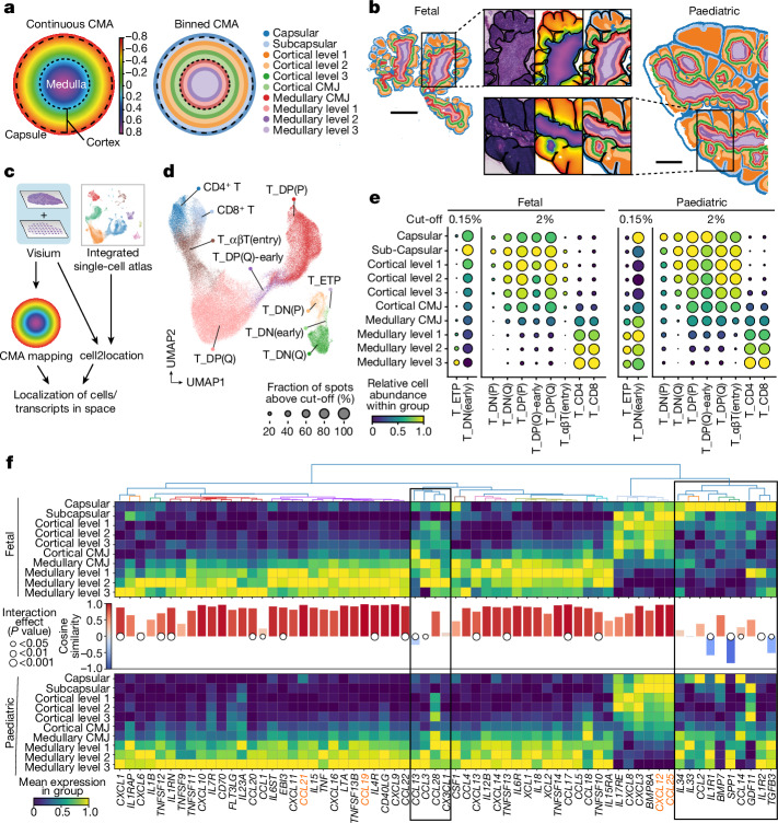 T cells develop from circulating precursor cells, which enter the thymus and migrate through specialized subcompartments that support their maturation and selection1. In humans, this process starts in early fetal development and is highly active until thymic involution in adolescence. To map the microanatomical underpinnings of this process in pre- and early postnatal stages, we established a quantitative morphological framework for the thymus-the Cortico-Medullary Axis-and used it to perform a spatially resolved analysis. Here, by applying this framework to a curated multimodal single-cell atlas, spatial transcriptomics and high-resolution multiplex imaging data, we demonstrate establishment of the lobular cytokine network, canonical thymocyte trajectories and thymic epithelial cell distributions by the beginning of the the second trimester of fetal development. We pinpoint tissue niches of thymic epithelial cell progenitors and distinct subtypes associated with Hassall's corpuscles and identify divergence in the timing of medullary entry between CD4 and CD8 T cell lineages. These findings provide a basis for a detailed understanding of T lymphocyte development and are complemented with a holistic toolkit for cross-platform imaging data analysis, annotation and OrganAxis construction (TissueTag), which can be applied to any tissue.