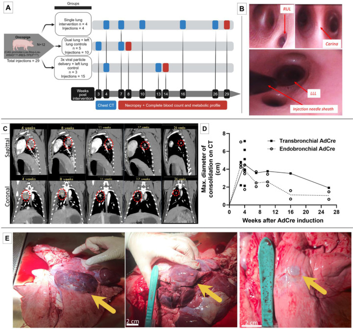 Methods: Twelve Oncopigs underwent 29 injections via flexible bronchoscopy. Eighteen Adenovirus-Cre recombinase gene (AdCre) inductions were performed endobronchially (n=6) and transbronchially with a needle (n=12). Eleven control injections were performed without AdCre. Oncopigs underwent serial contrast-enhanced chest CT with clinical follow-up for 29 weeks. Following autopsy, lung and organ tissues underwent histopathology, immunohistochemistry, and RNA-sequencing with comparative analysis with The Cancer Genome Atlas (TCGA) human LC data.