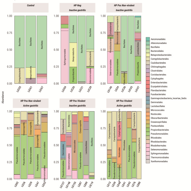 Helicobacter pylori infection is a major risk factor for gastric adenocarcinomas. In the case of the intestinal subtype, chronic gastritis and intestinal metaplasia are well-known sequential steps in carcinogenesis. H. pylori has high genetic diversity that can modulate virulence and pathogenicity in the human host as a cag Pathogenicity Island (cagPAI). However, bacterial gene combinations do not always explain the clinical presentation of the disease, indicating that other factors associated with H. pylori may play a role in the development of gastric disease. In this context, we characterized the microbial composition of patients with chronic gastritis (inactive and active), intestinal metaplasia, and gastric cancer as well as their potential association with H. pylori. To this end, 16 S rRNA metagenomic analysis was performed on gastric mucosa samples from patients with different types of lesions and normal gastric tissues. Our main finding was that H. pylori virulence status can contribute to significant differences in the constitution of the gastric microbiota between the sequential steps of the carcinogenesis cascade. Differential microbiota was observed in inactive and active gastritis dependent of the H. pylori presence and status (p = 0.000575). Pseudomonades, the most abundant order in the gastritis, was associated the presence of non-virulent H. pylori in the active gastritis. Notably, there are indicator genera according to H. pylori status that are poorly associated with diseases and provide additional evidence that the microbiota, in addition to H. pylori, is relevant to gastric carcinogenesis.