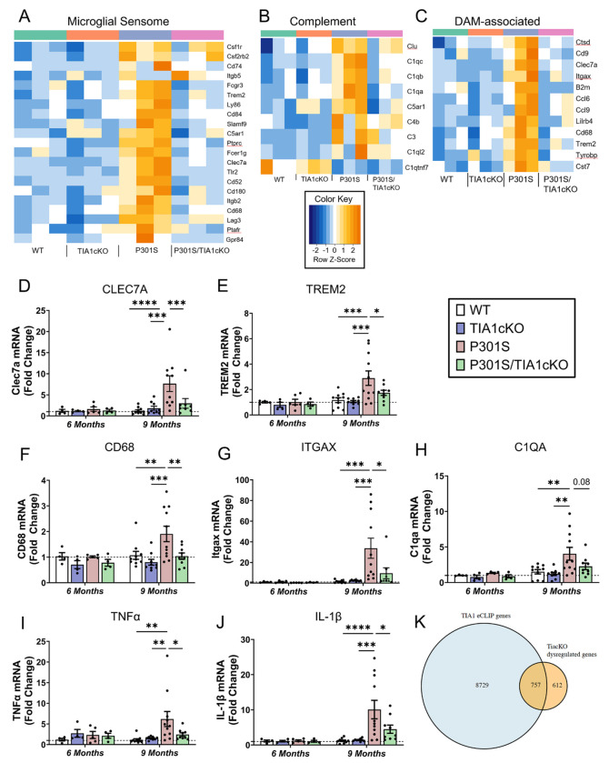 The RNA binding protein TIA1 is known to regulate stress responses. Here we show that TIA1 plays a much broader role in inflammatory cells, being required for the microglial sensome. We crossed TIA1 cKO mice (using a CX3CR1 driven cre element) to PS19 MAPT P301S tauopathy mice. The peripheral macrophages of TIA1 cKO mice exhibited a hyper-inflammatory phenotype with increased cytokine signaling, as expected. Surprisingly, the brains of these mice showed striking reductions in inflammation, including decreases in microglial inflammatory cytokines (TNFα and IL-1β) and sensome markers (CLEC7A, TREM2, ITGAX); these reductions were accompanied by corresponding decreases in tau pathology. Analysis of the brain TIA1 protein interactome identified brain selective TIA1 protein mediated pathways, including strong interactions with the microglial protein C1q, which directs pruning of dystrophic neurons. These results uncover a previously unknown regulatory role for TIA1 in microglial activation in the context of neurodegenerative disease and highlights the divergent regulation of two mononuclear phagocytic lineages: microglia and macrophages.