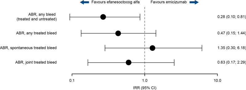 Results: One emicizumab trial was included (HAVEN 3), which investigated three dosing regimens. In meta-analyses, efanesoctocog alfa once-weekly (Q1W) was associated with significantly lower ABRs for any (incidence rate ratio [95% CI] 0.33 [0.20; 0.53]), any treated (0.49 [0.30; 0.80]) and treated joint (0.51 [0.28; 0.91]) bleeds compared with emicizumab Q1W in non-inhibitor patients with prior prophylaxis or on-demand treatment. Efanesoctocog alfa Q1W was also associated with a significantly better improvement from baseline in HJHS Joint Score (mean difference [95% CI] -2.06 [-3.97; -0.14]) and Total Score (-2.37 [-4.36; -0.39]) versus emicizumab Q1W or every 2 weeks.