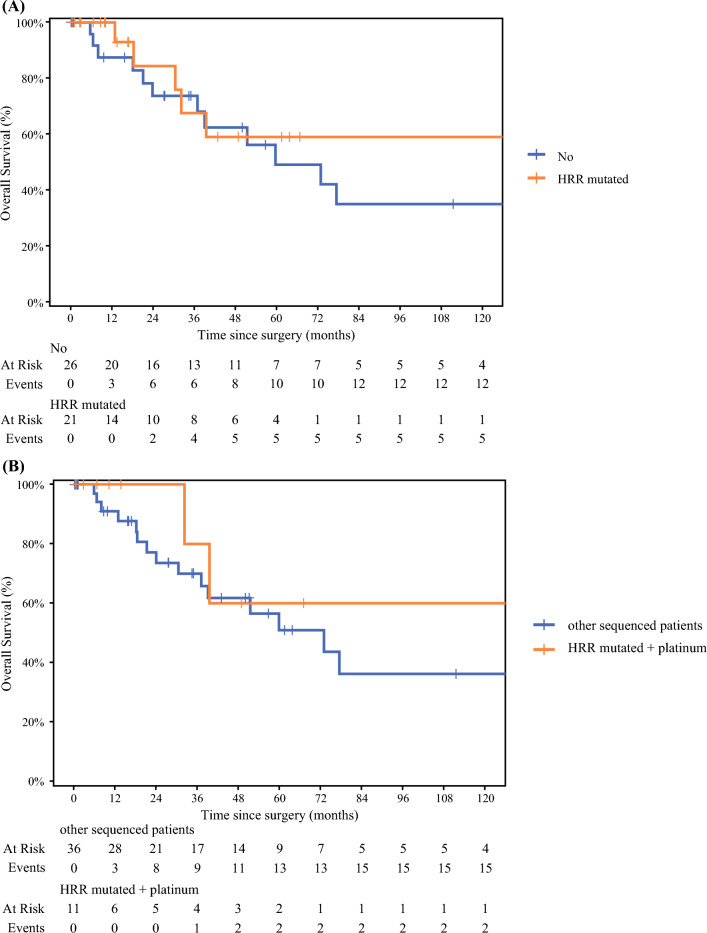 Results: A total of 61 patients with resected pACC were identified. Median overall survival (OS) was 73 months and median recurrence free survival was 22 months. Nine patients underwent resection for oligometastatic disease; median OS was not reached after a median follow-up of 31 months from date of metastasectomy. Adjuvant chemotherapy was administered in 67% of patients with FOLFOX/FOLFIRINOX (5-fluorouracil, leucovorin, oxaliplatin, ± irinotecan) the most common regimen (58%). Sequencing data were obtained in 47 (77%) patients. A mutation in at least one of three core genes associated with the homologous recombination repair (HRR) pathway (BRCA1, BRCA2, or PALB2) occurred in 26% (n = 12) with BRCA2 the most frequently identified. A mutation in any other "non-core" gene associated with DNA damage repair or the HRR pathway was identified in 45% (n = 21) with a high tumor mutational burden of > 10 mutations per megabase in 13%.