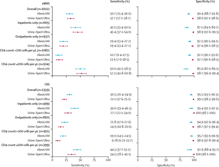 Findings: Between Dec 13, 2019, and Aug 5, 2021, 3528 potentially eligible individuals were screened and 1731 were enrolled, of whom 1602 (92·5%) were classifiable by the eMRS (median age 40 years [IQR 33-48], 838 [52·3%] of 1602 were female, 764 [47·7%] were male, 937 [58·5%] were outpatients, 665 [41·5%] were inpatients, median CD4 count was 374 cells per μL [IQR 138-630], and 254 [15·9%] had microbiologically confirmed tuberculosis). Against eMRS as reference, sensitivities of Urine-Xpert Ultra and AlereLAM were 32·7% (95% CI 27·2-38·7) and 30·7% (25·4-36·6) and specificities were 98·0% (97·1-98·6) and 90·4% (88·7-91·8), respectively. Against CRS as reference, sensitivities of Urine-Xpert Ultra and AlereLAM were 21·1% (95% CI 17·6-25·1), and 30·5% (26·4-34·9), and specificities were 99·1% (98·3-99·6) and 95·1% (93·5-96·3), respectively. The combination of Sputum-Xpert Ultra with AlereLAM or Urine-Xpert Ultra diagnosed 202 (77·1%) and 204 (77·9%) of 262 eMRS-positive participants, respectively, in incompletely overlapping groups; combining all three tests diagnosed 214 (81·7%) of 262 eMRS-positive participants INTERPRETATION: Urine-Xpert Ultra could offer promising clinical utility in addition to AlereLAM and Sputum-Xpert Ultra. In inpatient settings where both AlereLAM and Urine-Xpert Ultra are possible, both should be offered to support rapid diagnosis and treatment.