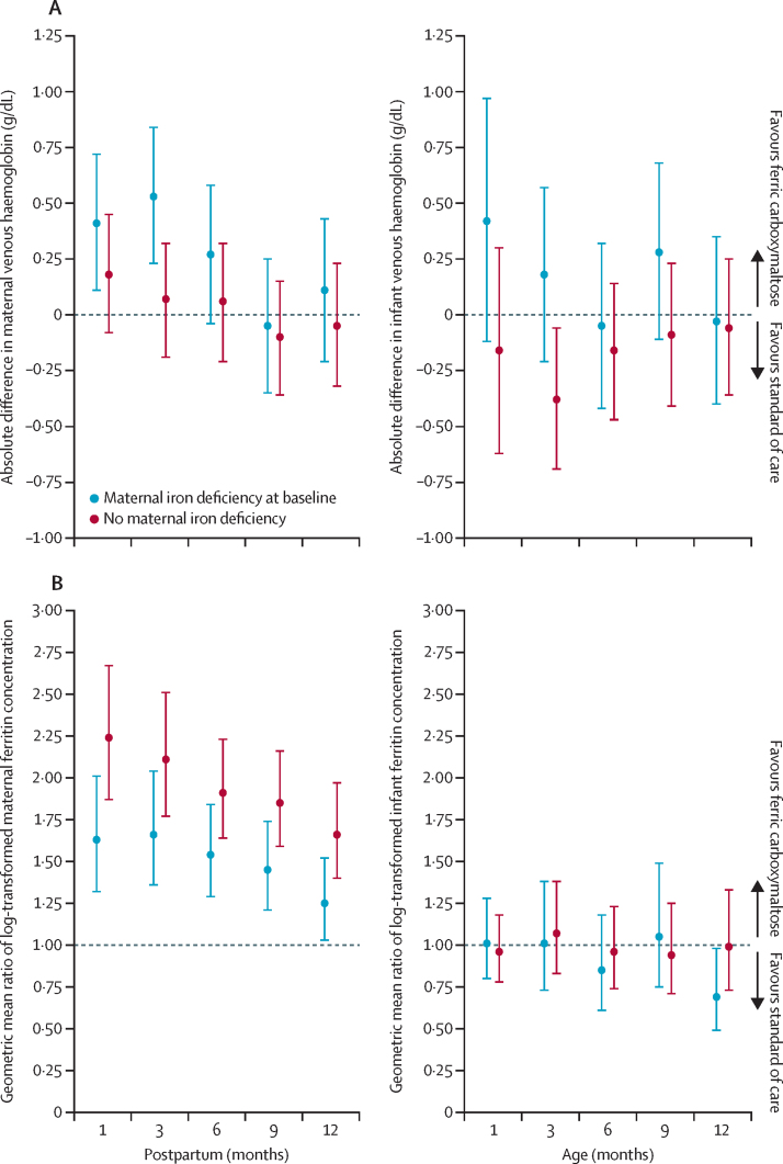 Findings: Between Nov 12, 2018, and March 2, 2021, 862 women were randomly assigned in REVAMP, of whom 793 (393 in the ferric carboxymaltose group [376 liveborn infants] and 400 [379 liveborn infants] in the standard-of-care group) provided consent for REVAMP-EXTENDED. At 12 months postpartum, ferritin concentrations were higher (geometric mean ratio 1·47 [95% CI 1·29-1·66], p<0·0001), and prevalence of iron deficiency was lower (prevalence ratio 0·65 [0·48-0·88], p=0·0050), in mothers receiving ferric carboxymaltose than in those receiving standard of care. Anaemia was less common in women who received ferric carboxymaltose than in those who received standard of care at 1 month (prevalence ratio 0·84 [95% CI 0·71-0·98], p=0·027), 3 months (0·75 [0·62-0·91], p=0·0029), and 6 months (0·78 [0·63-0·96], p=0·018) postpartum but not thereafter. There was no evidence of a difference between groups regarding cord ferritin, infant ferritin, or infant haemoglobin concentrations at any timepoint. Benefits on postpartum anaemia were restricted to mothers with baseline iron deficiency.