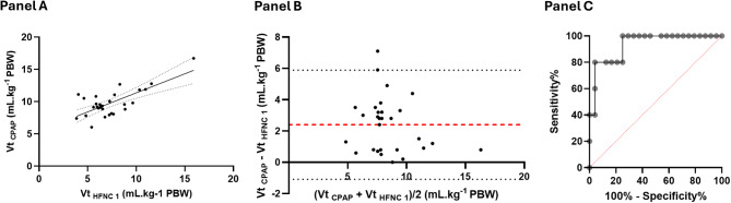 Results: Under HFNC, patients had a tidal volume of 6.6 (5.9-8.7) mL.kg- 1 PBW. 20 (69%) patients exhibited a tidal volume between 4 and 8 mL.kg- 1 PBW, while in 5 (17%) patients it exceeded 9 mL.kg- 1 PBW. Tidal volume under CPAP was higher (9.4 (8.3-11) mL.kg- 1 PBW, p < 0.001). Tidal volumes under CPAP and under HFNC were modestly correlated (Spearman r = 0.50, p = 0.005). Bland-Altman analysis showed a bias of 2.4 mL.kg- 1, with limits of agreement ranging from - 1.1 mL.kg- 1to 5.9 mL.kg- 1. Nevertheless, a larger (> 11.5 mL.kg- 1 PBW ) tidal volume under low-level CPAP predicted a larger (> 9 mL.kg- 1 PBW ) tidal volume under HFNC with 80% sensitivity and 96% specificity. Low-level CPAP was associated with increased minute ventilation, end-expiratory lung volume, and oxygenation as compared to HFNC. It decreased signs of respiratory distress in the most severe patients but was associated with lower comfort compared to HFNC.